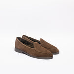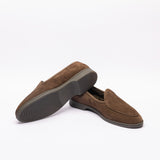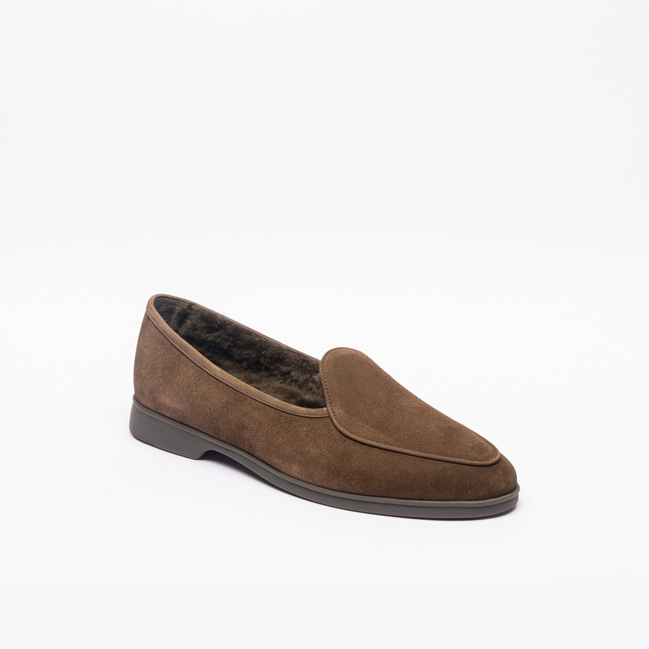 Mocassino fatto a mano in vitello scamosciato foderato in pelo, soletta interna brevettata B&L imbottita per ammortizzare la camminata, suola in gomma