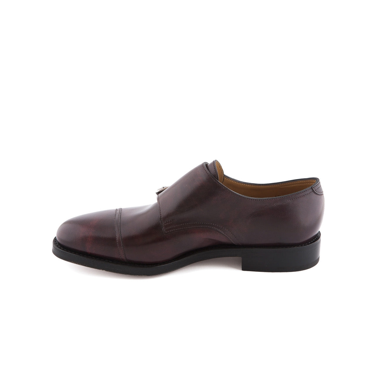 Doppia fibbia in pelle di vitello bordeaux (Plum museum calf) con puntale cucito, fibbie argentate, suola in doppio fondo cuoio.