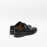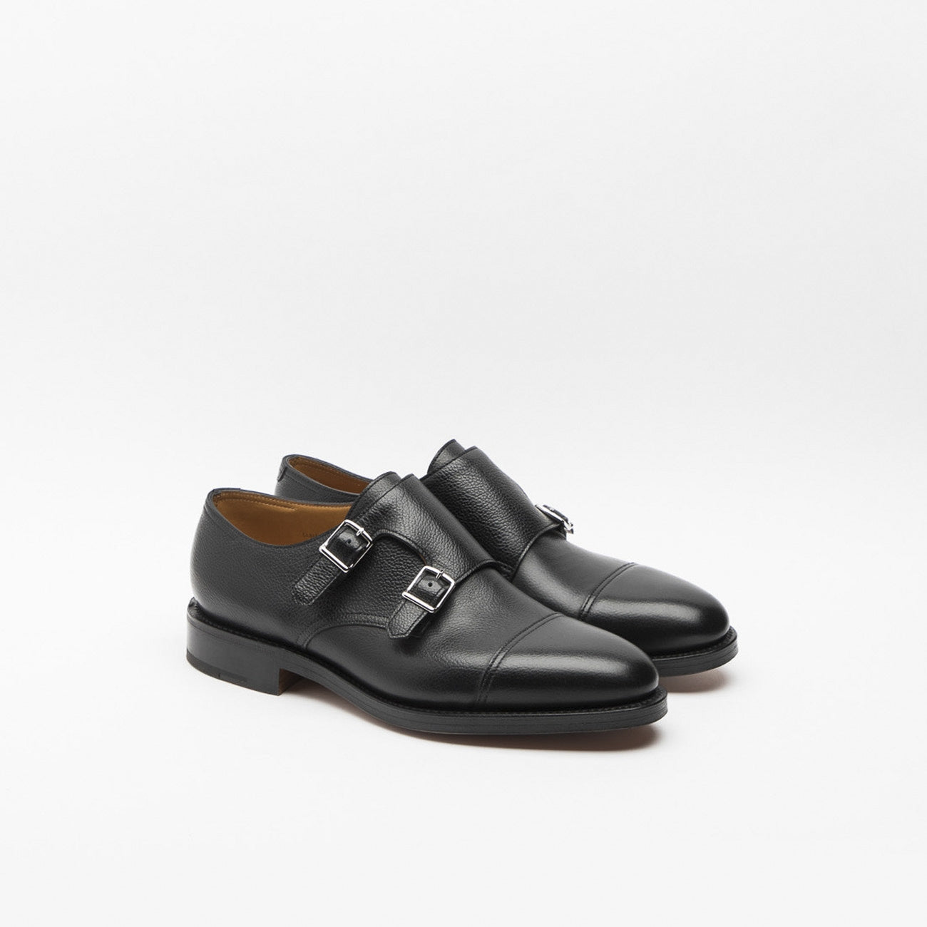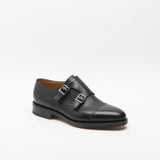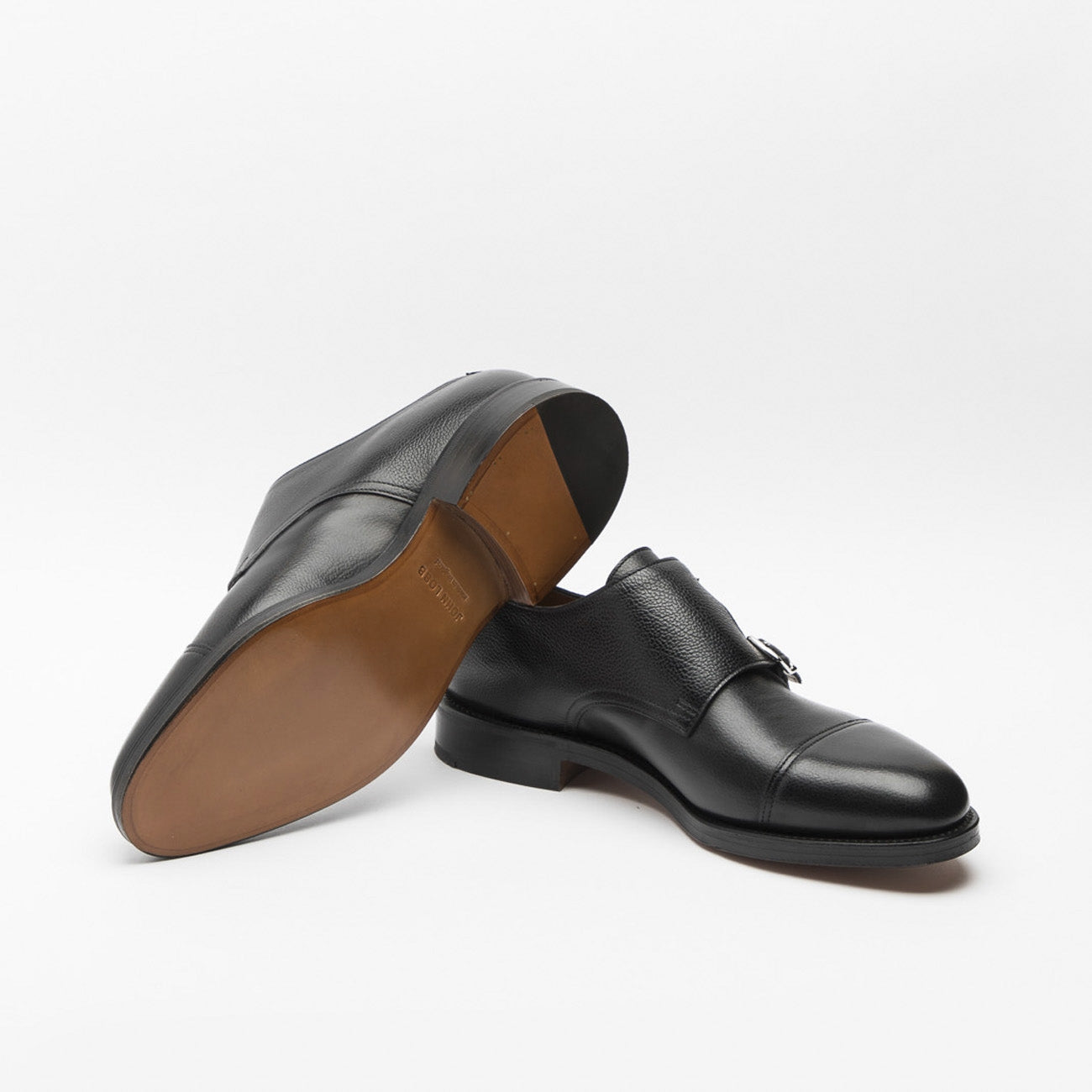 Doppia fibbia in pelle di vitello martellata nera con puntale cucito, fibbie argentate, suola in doppio fondo cuoio.