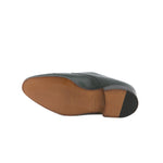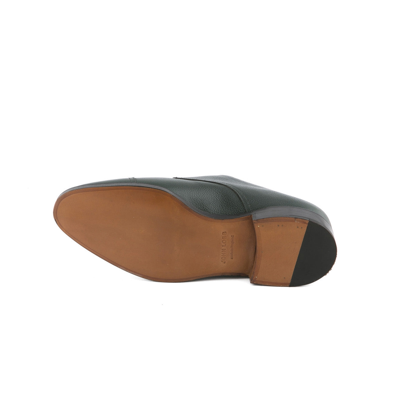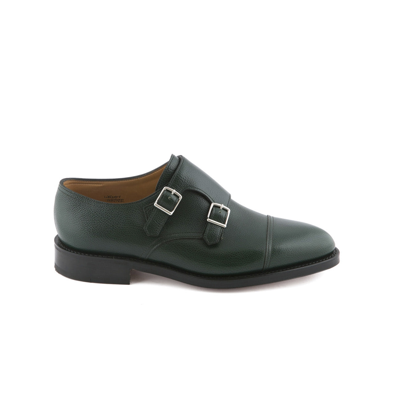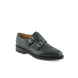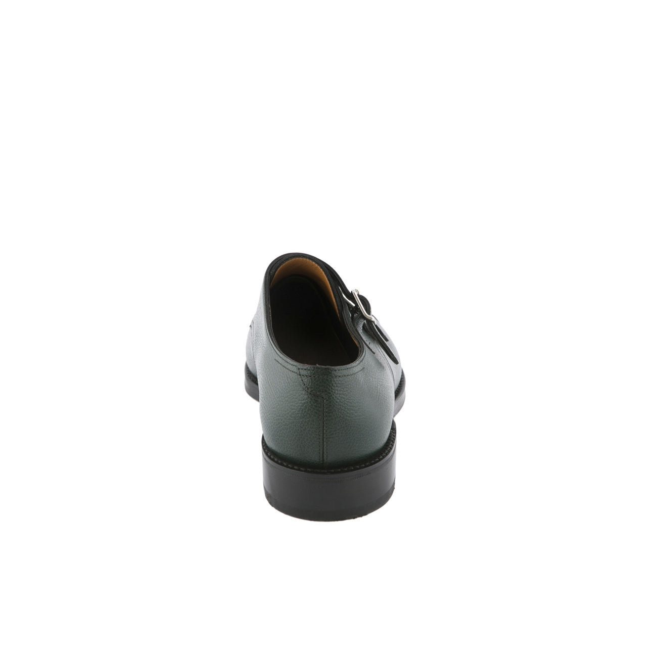 Doppia fibbia in pelle di vitello martellata verde con puntale cucito, fibbie argentate, suola in doppio fondo cuoio.