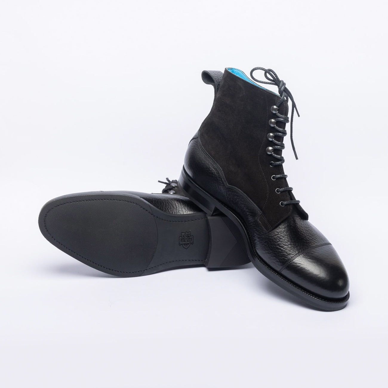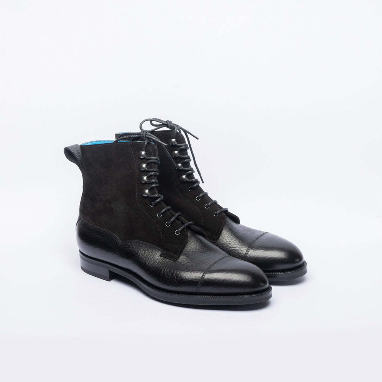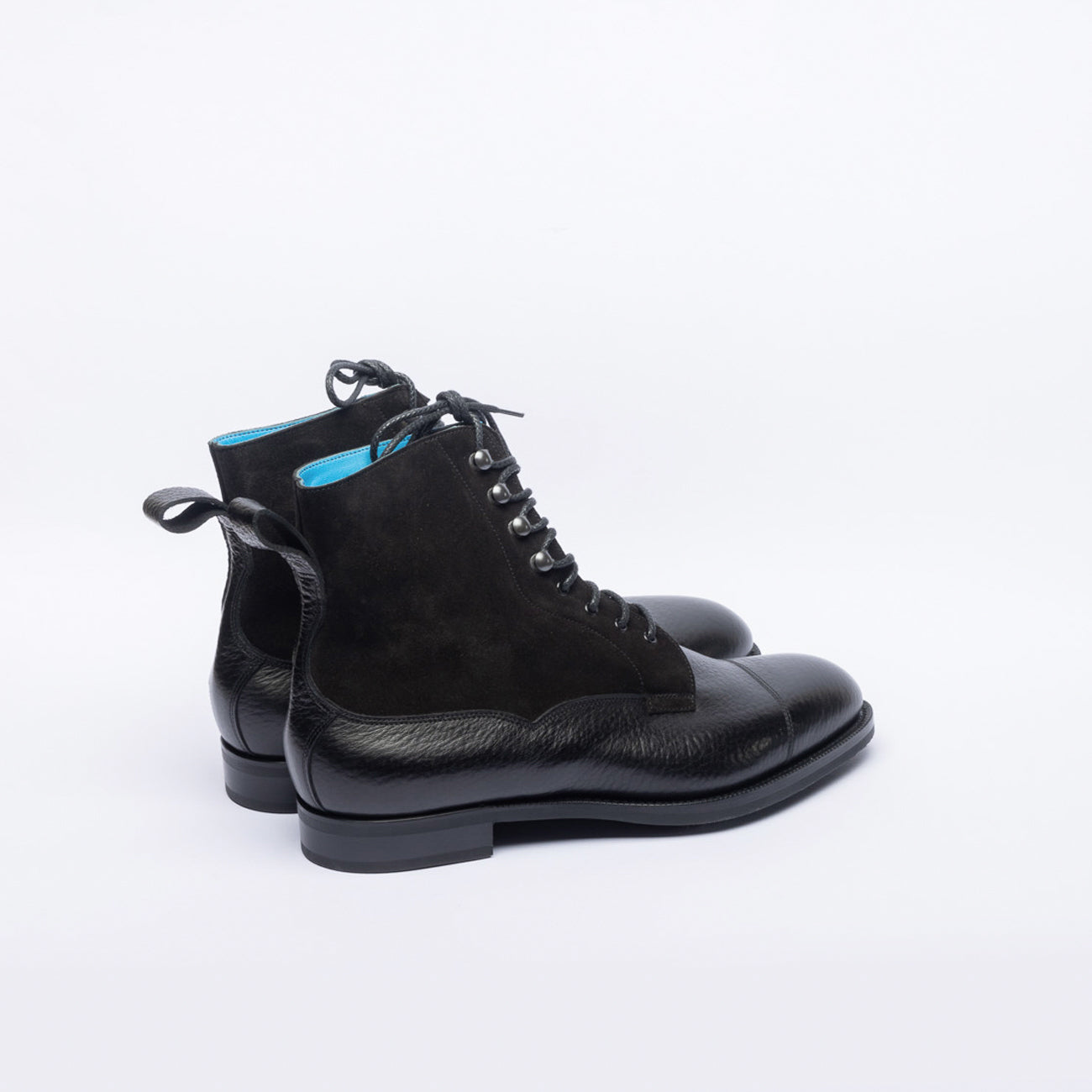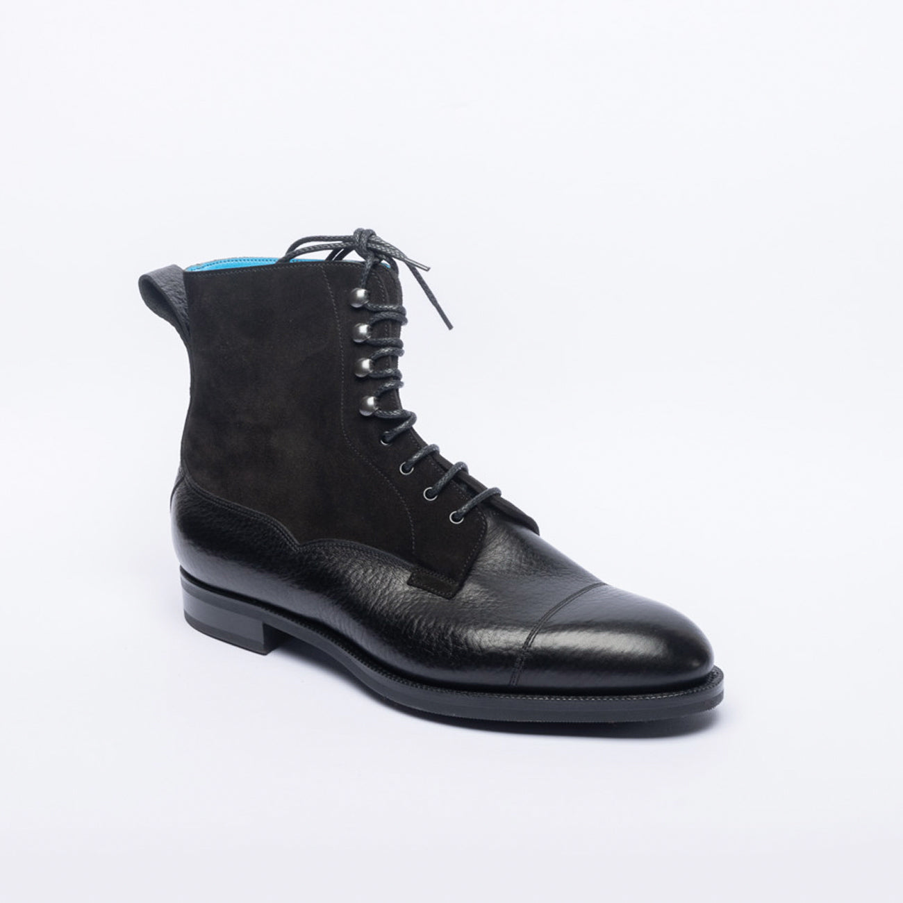 Stivaletto derby bi-material in vitello martellato/scamosciato nero (black London grain / suede calf) con puntale cucito, suola in gomma.