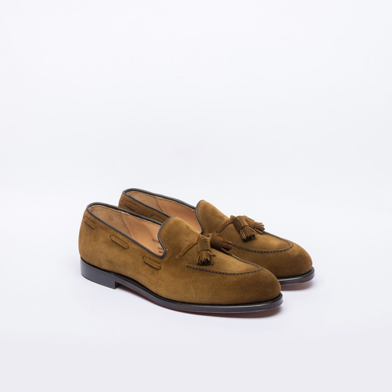 Mocassino con nappine in camoscio verde (Seaweed suede), suola in mono fondo cuoio.