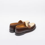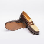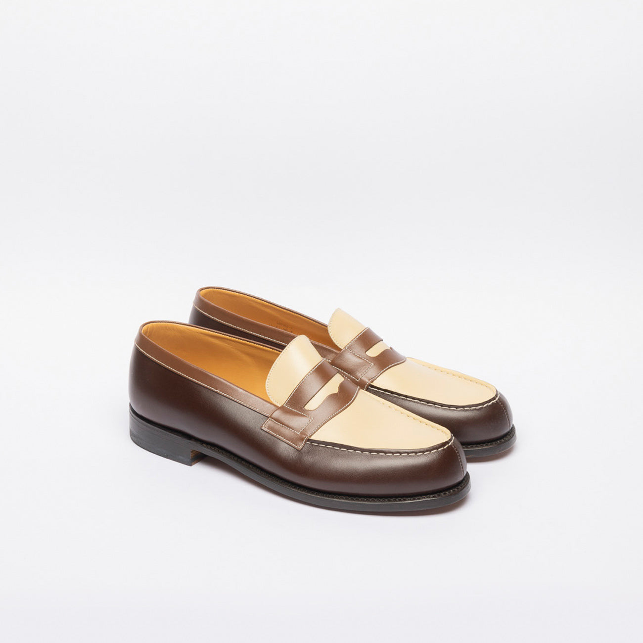 Mocassino J.M. Weston 180 tricolor dark brown, tan, porcelaine con pelle di vitello di alta qualità e fodera color naturale per un comfort duraturo. Costruzione goodyear e suola cuoio, prodotta con metodo di concia vegetale extra lenta della conceria Bastin E fils. Made in France dal 1946.