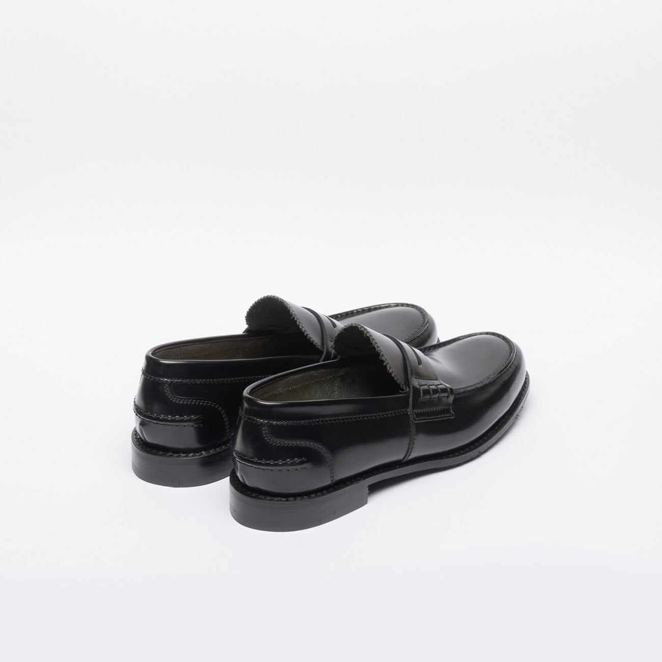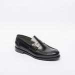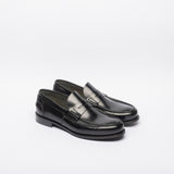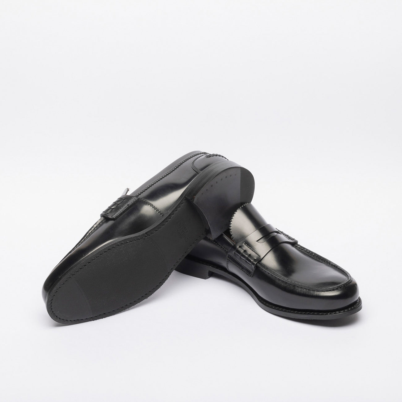 Mocassino penny loafer sfoderato in pelle nera spazzolata di vitello, lavorazione Goodyear, suola in mono fondo gomma.