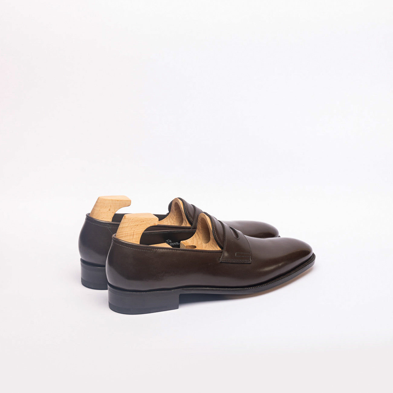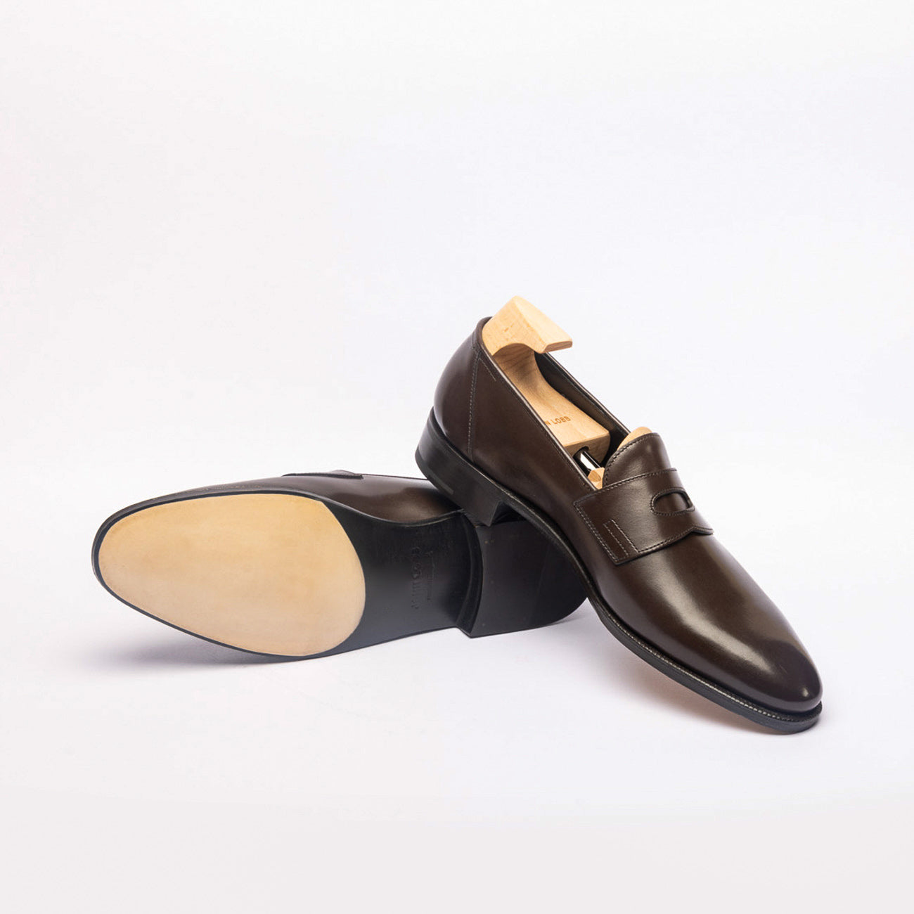 Mocassino prestige in pelle marrone di vitello oxford, linee lisce ed eleganti, suola in cuoio, forme John Lobb incluse.
