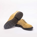 Stringata derby gaucho suede con coda di rondine, soletta interna e fodera interna in pelle, lavorazione Goodyear, guardolo antipioggia, suola gomma Dainite.